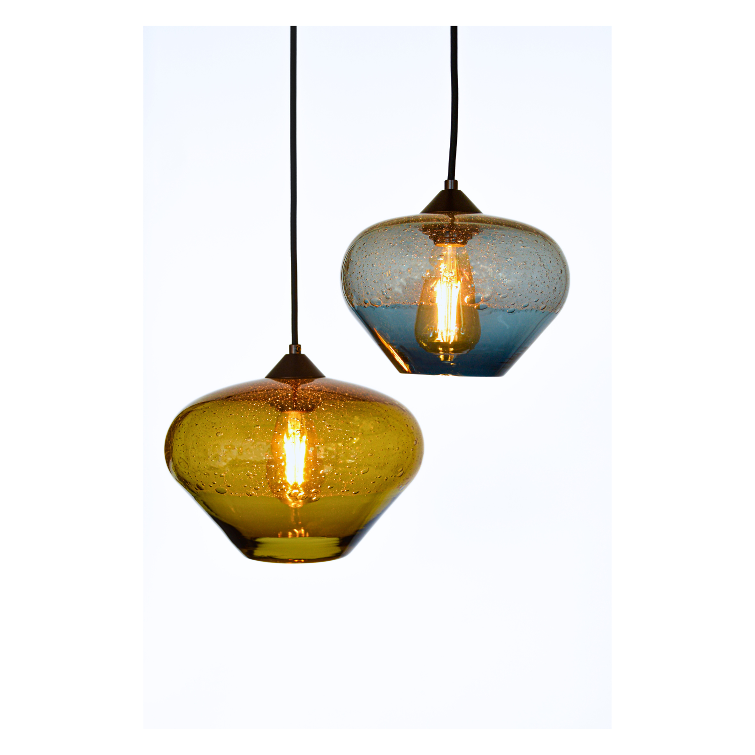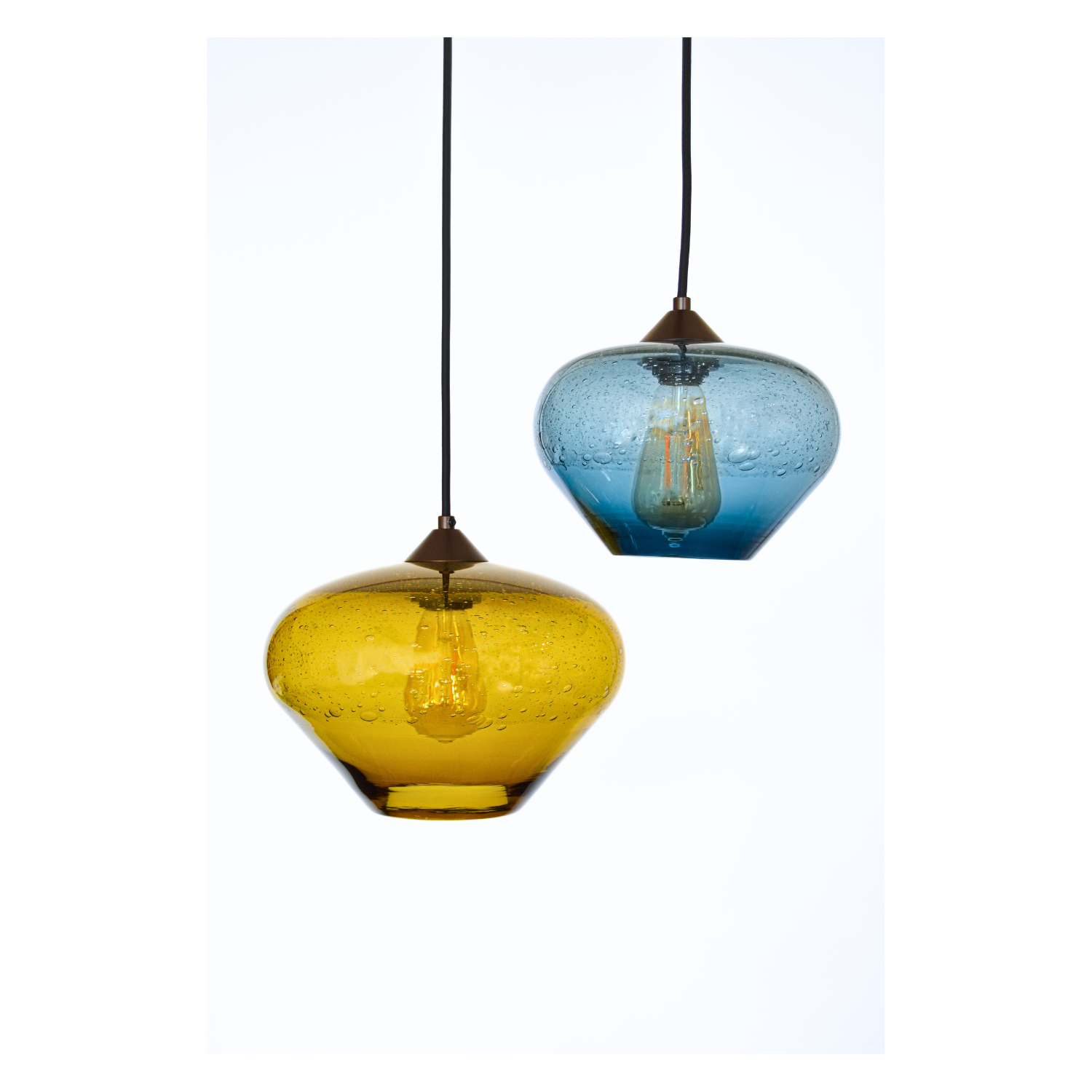 The Seeded Olga's silhouette embodies our design principles of sleekness, modernity, and refinement. Handblown in the mountains of Asheville, North Carolina, our hand-crafted art glass pendants are individually handblown with design and quality in mind. Choose from various sizes and colors to coordinate with your home's aesthetic.Â