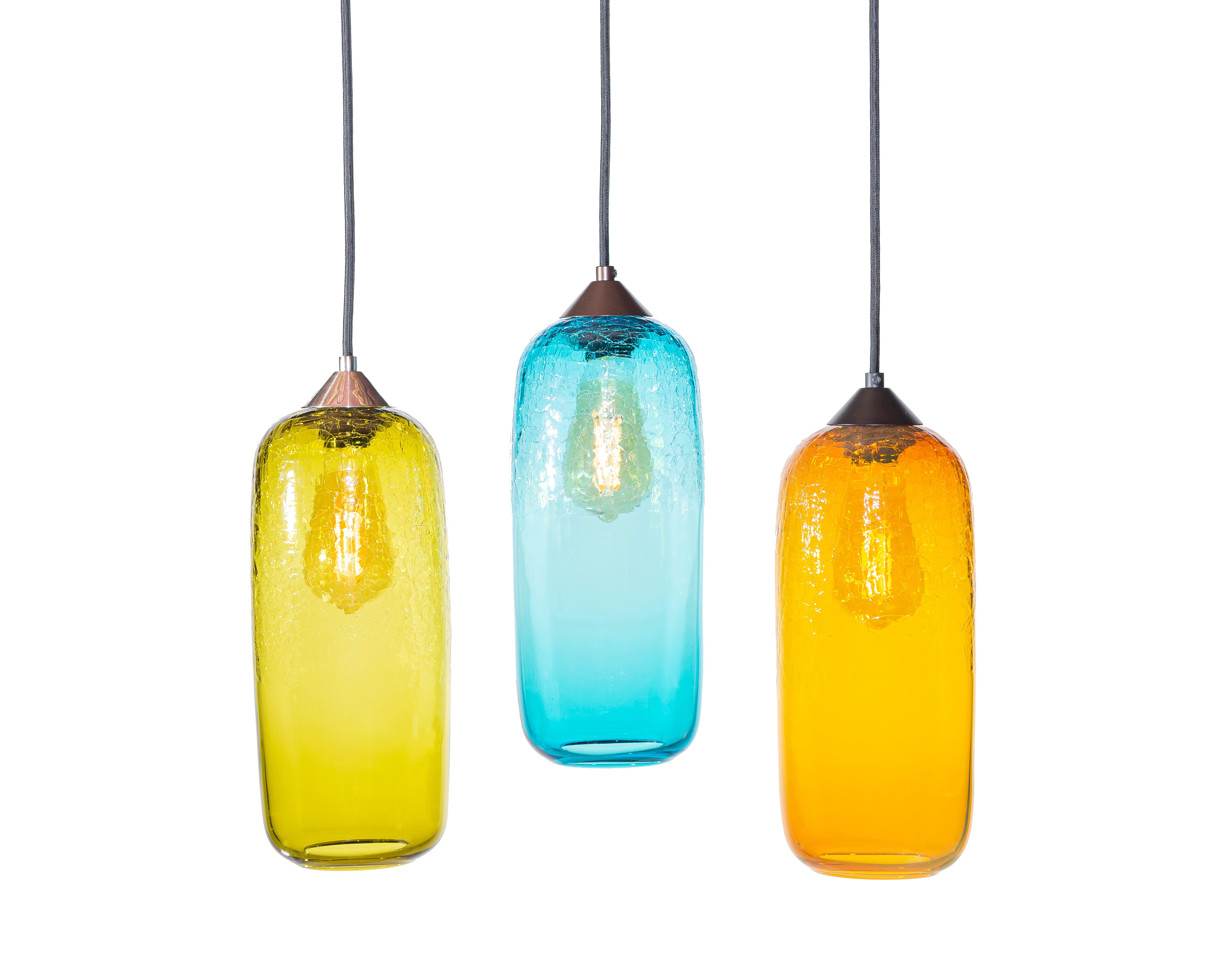 Hand-crafted in Asheville, North Carolina, our hand-blown glass pendant lights are individually handmade with design and quality in mind. Available in a variety of sizes and colors to coordinate with your kitchen, bathroom, or home design. The Pill Pendant is detailed with a crackled texture that gives this glass shade a crisp modern look while helping to deflect the light.