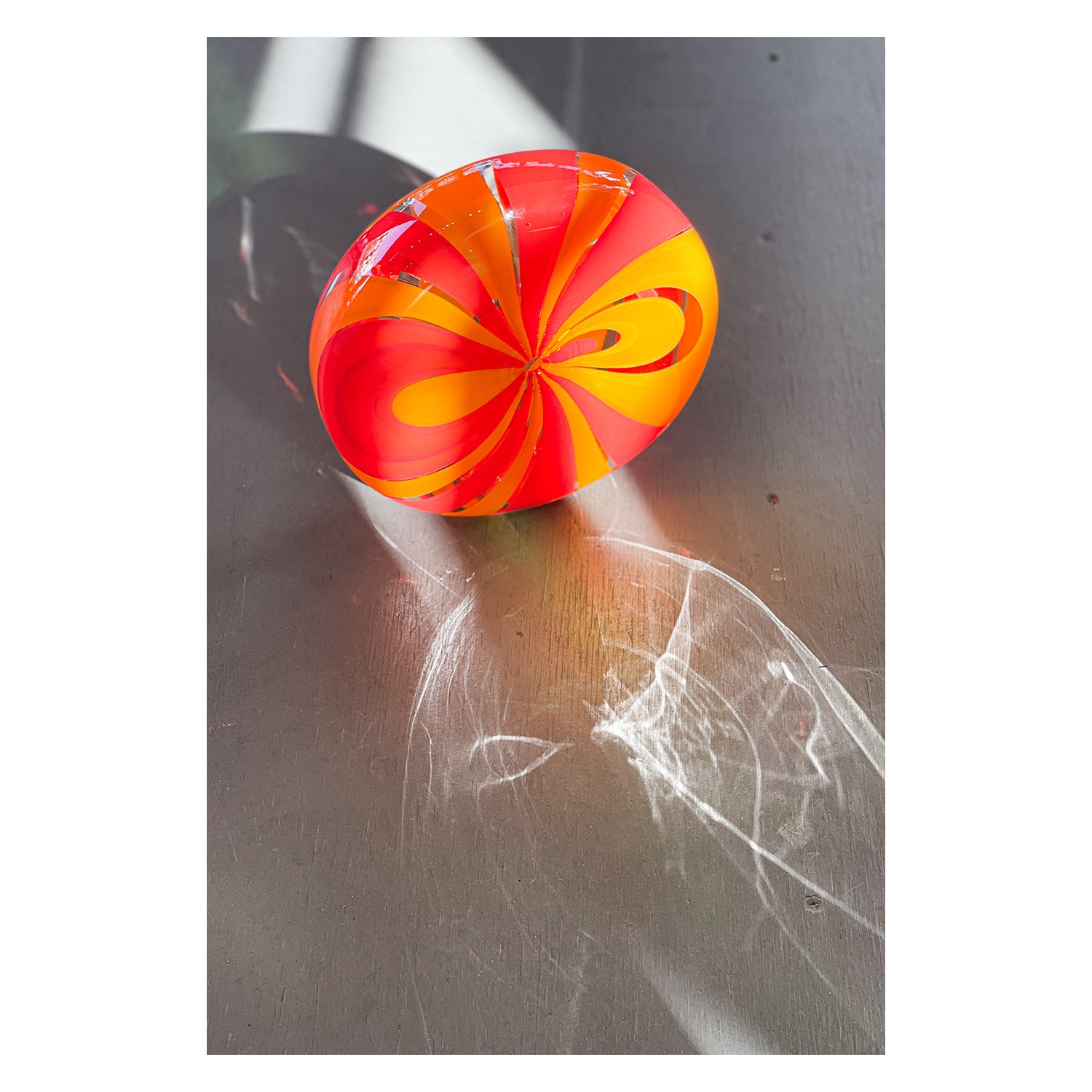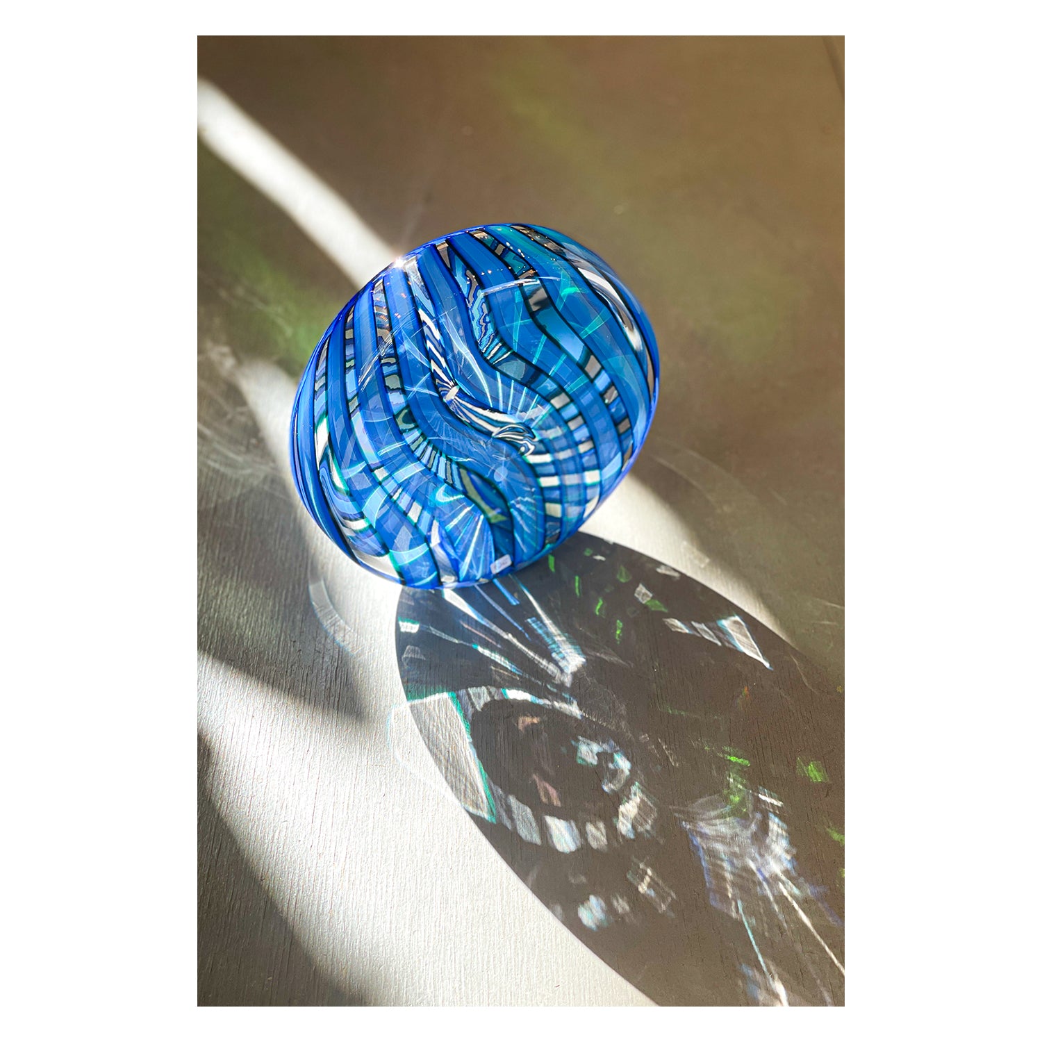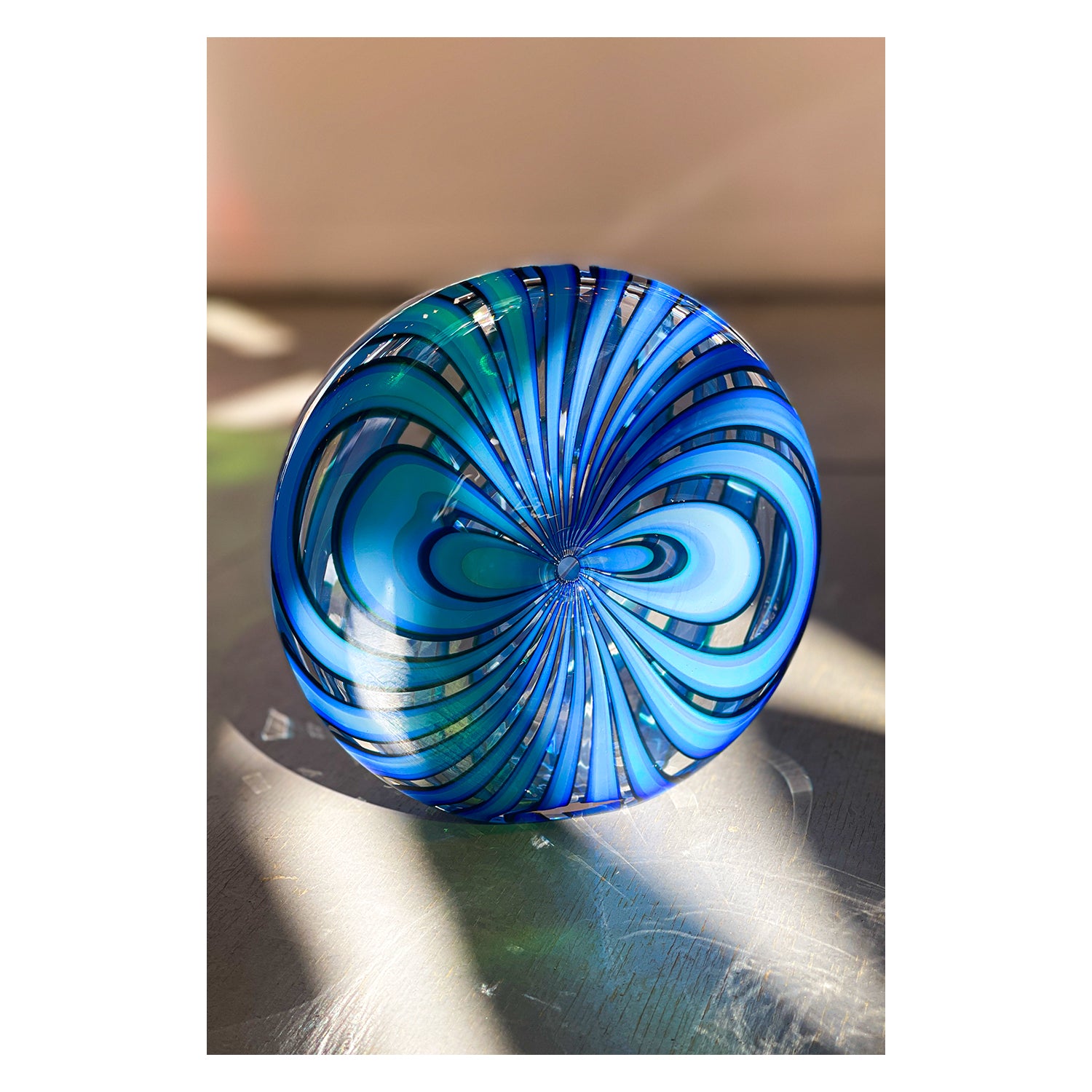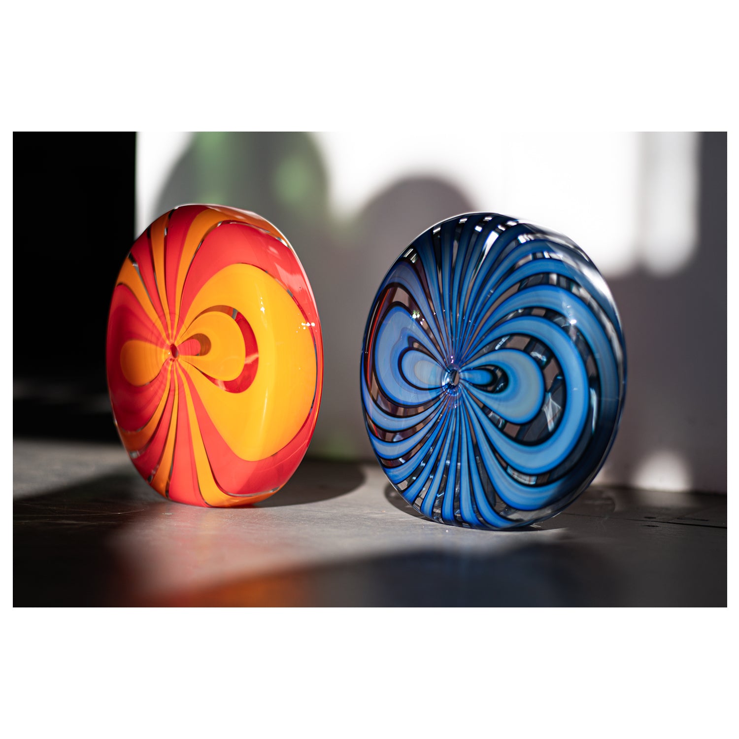 Resembling a pinwheel, these sculptural pieces feature a unique shape and cane pattern. This one-of-a-kind, handblown piece is perfect for displaying in small spaces.