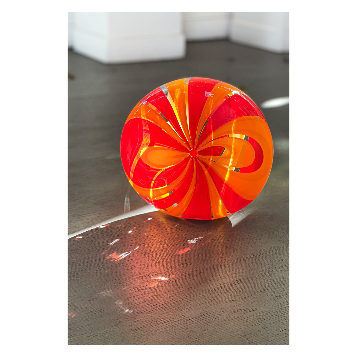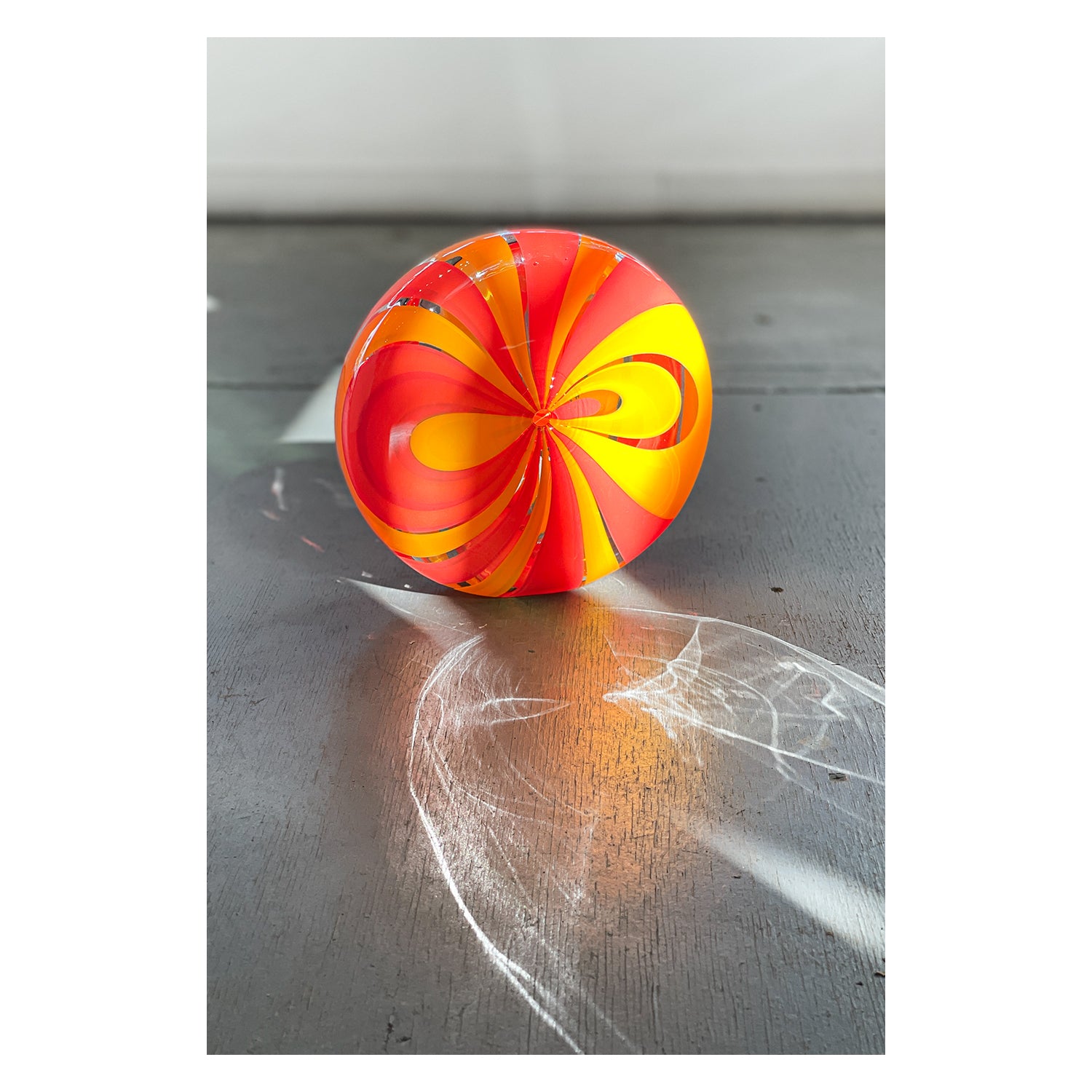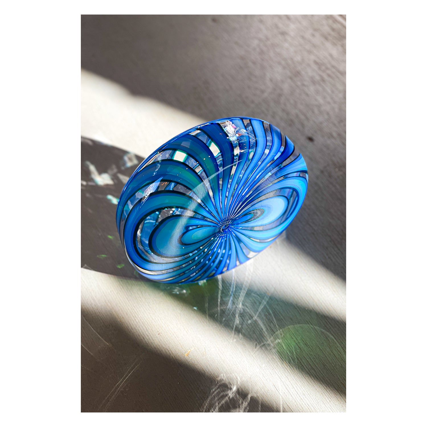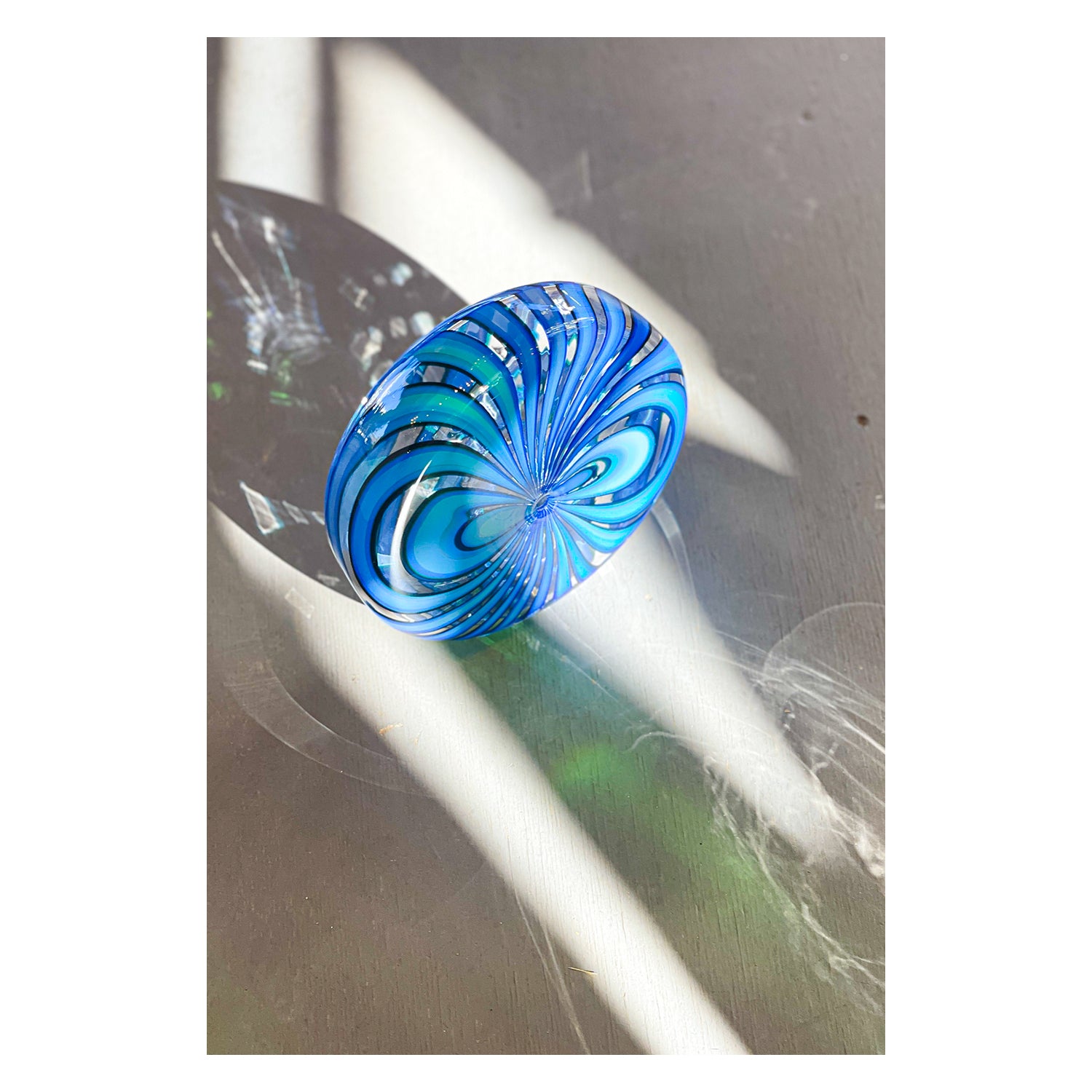 Resembling a pinwheel, these sculptural pieces feature a unique shape and cane pattern. This one-of-a-kind, handblown piece is perfect for displaying in small spaces.